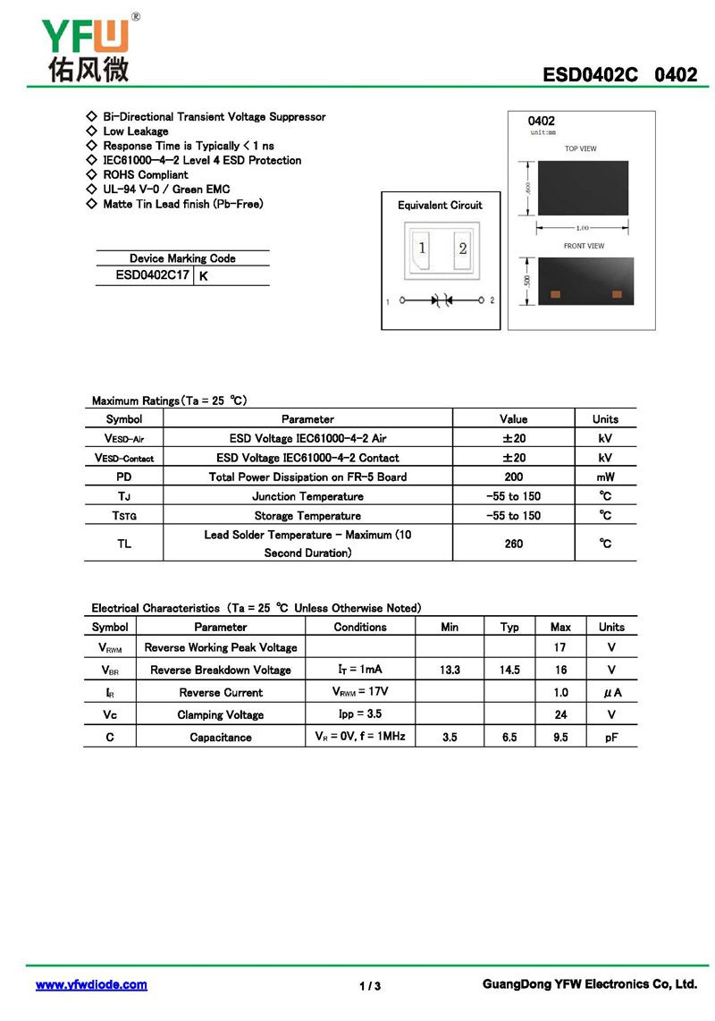 静电保护二极管ESD0402C17 规格书_价格_PDF手册-广东佑风微原厂ESD0402C17 0402_(YFW佑风微)品牌