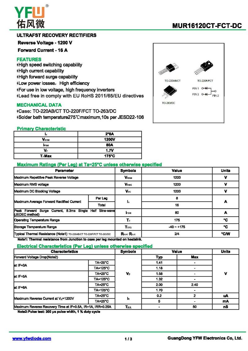 超快恢复二极管MUR16120CT 规格书_价格_PDF手册-广东佑风微原厂MUR16120CT TO-220AB_(YFW佑风微)品牌